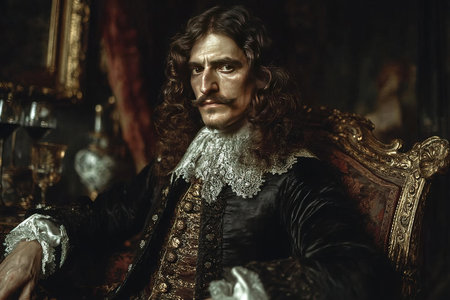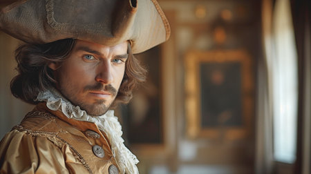 A graceful musketeer dressed in period garb, displaying courage and gallantry in a captivating Renaissance environment
