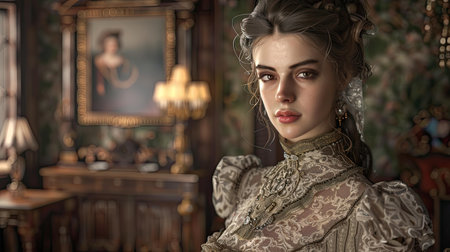 The Victorian era concept. Beautiful woman in elegant historical dress and hairstyle posing in vintage interior.