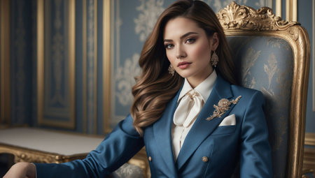 An AI generated illustration of a confident young female in a blue formal suit and white shirt sitting comfortably in a chair, looking off to the side