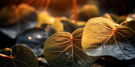 The Yellow velvetleaf at sunset, Golden red sunset light filters through the leaves, still atmosphere, warm orange glow blending with natural green