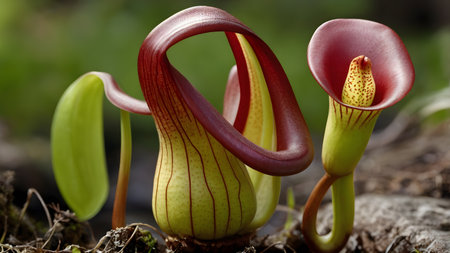 Design a detailed 4k illustration of a pitcher plant, showcasing its unique form and vibrant, insect-trapping mechanism --chaos 30 --ar 16:9 --v 6.1 Job ID: 19194c5f-c69d-4268-a42d-b4bd6ed50aa9