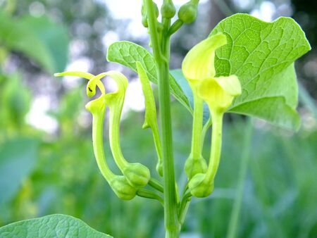 Aristolochia flower on green leaf in the garden background