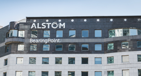 Nanterre, FRANCE, May 09, 2017 - Close-up on the skyscraper ALSTOM, an office building located in the heart of the business district of defense, in Paris, France