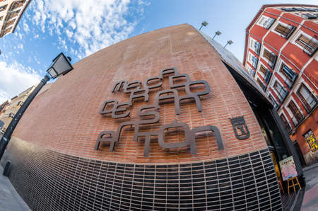 MADRID, SPAIN - SEPTEMBER 3, 2017: A fisheye outside view of the Mercado de San Anton (San Anton market), a food market located in the centric Chueca neighborhood of Madrid; originaly built in 1945, in 2007 the old building was demolished and a new one