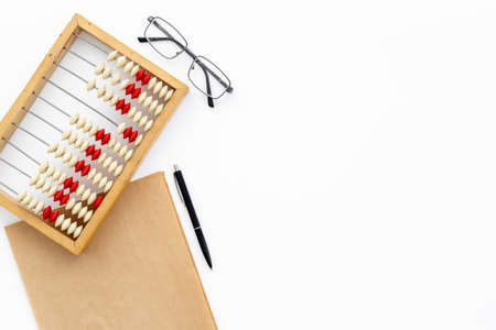 Old wooden abacus, white background. Retro calculator of money. Concept of business.