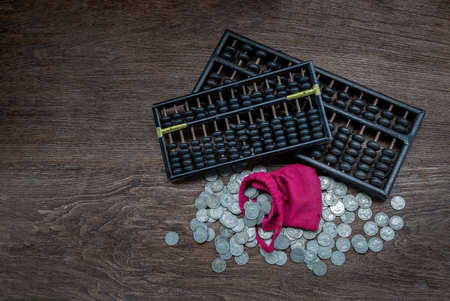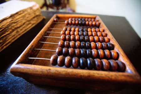 Old accounting wooden abacus. Financial calculations background