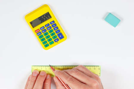 Engineer hands at work with a pencil and ruler on a white sheet of paper