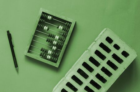 Wooden abacus, brick and pen. Accounting in a construction company. View from above. Tinted photo. Calm colors.
