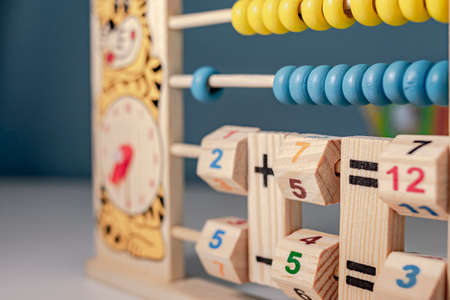 Children's wooden game to learn the hours of a clock and simple math of addition, subtraction, multiplication and division, called abacus