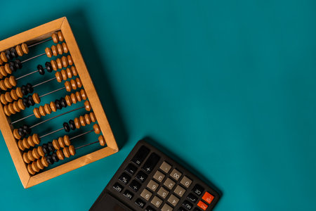 Top view of vintage abacus and modern calculator on a green background, the concept of finance and mathematical calculations