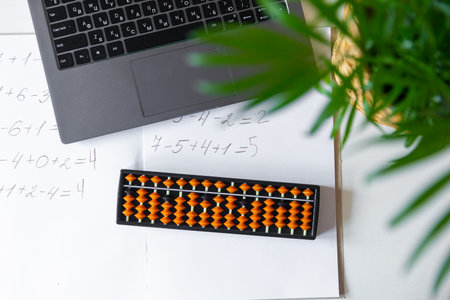 abacus for mental arithmetic on a table with a laptop, nobody. The concept of learning mathematics for children, Russian mathematics