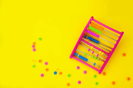 Educational colorful abacus beads for kids isolated on yellow background.Broken, learning equipment. Calculating thinking concept, with space for text