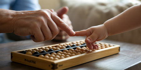 A close-up shot focuses on an adult's hand and a child's hand interacting with a wooden abacus. The adult's finger gently touches the child's finger as they both reach towards the abacus, which is filled with light brown and black beads. The wooden frame of the abacus is visible, resting on a dark wooden surface. The background is softly blurred, suggesting an indoor domestic setting.