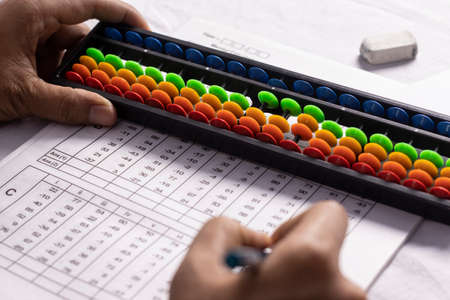 Doing mental math or mental arithmetic. Hand of little boy using abacus for calculating. Learning to use abacus on mental math courses. A kid doing math at home with abacus
