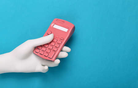 Hand holding Pink calculator on blue background. minimalism. creative layout. fresh ideas.