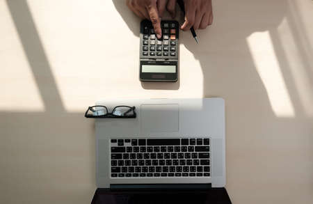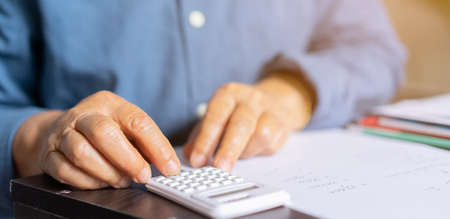 Close up businessman using calculator on documents Unrecognizable finance use calculate about cost at office