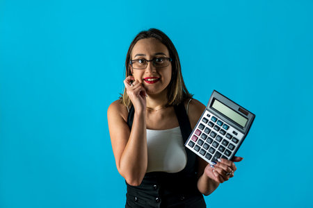 Photo of the CEO of a young brunette lady holding a calculator shouting wearing glasses isolated on a blue background. business. business lady. strict woman portrait of a woman
