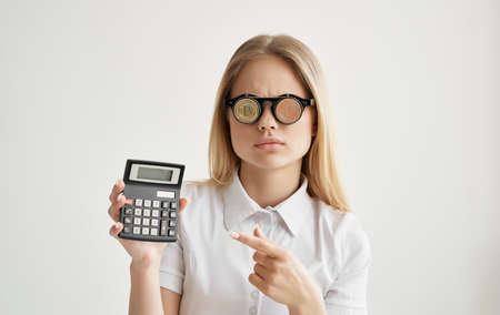 cheerful woman glasses in the form of cryptocurrency Bitcoin calculator financial money