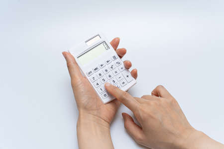 The female hand holds the calculator on a white background