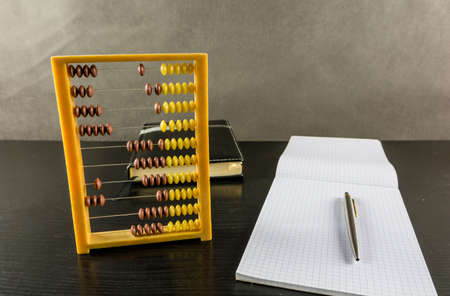 Calculations on an old abacus and a notebook for saving results with a pen.