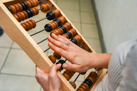 Vintage abacus close-up on a gray background. A womans hand. The concept of modern technologies in accounting.