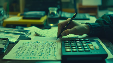A man counts on a calculator and writes data on paper.