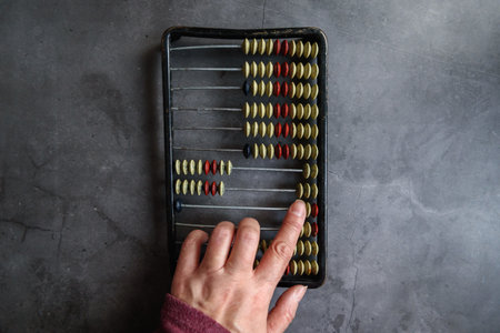 A middle-aged Caucasian man makes calculations on a wooden abacus. The calculator is nearby. Close-up of a male hand with an obsolete device for mathematical calculations.