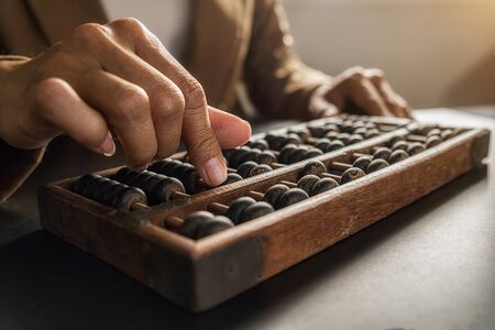 Asian woman hands accounting with old abacus. Financial design concept.
