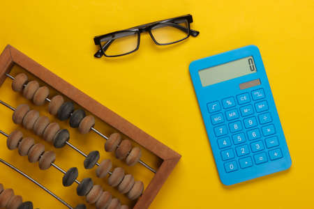 Vintage abacus and calculator, glasses on yellow background. Top view.