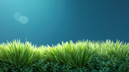 This image features lush green grass blades against a soft blue background, creating a serene and refreshing atmosphere. Ideal for nature themes and outdoor projects.