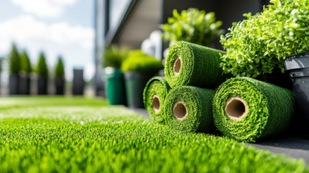 This macro shot features vibrant green artificial grass blades under natural lighting, offering a textured view against a blurred, sunny outdoor backdrop. Lawn care concept.