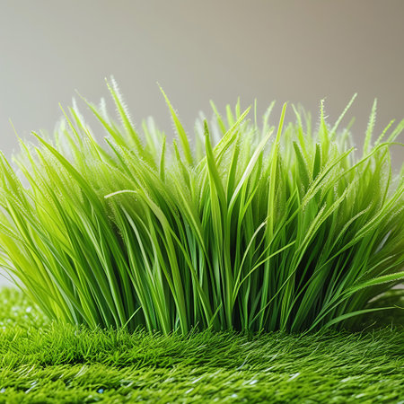 Extreme close-up of dense, vibrant green grass blades with delicate fuzzy tips, set against a soft, neutral background.
