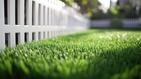 White wooden picket fence in sharp focus, with green artificial turf stretching into the background.