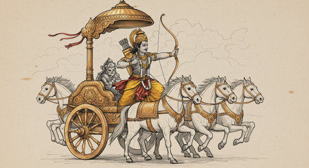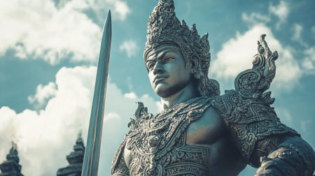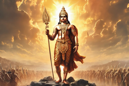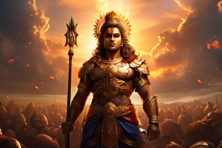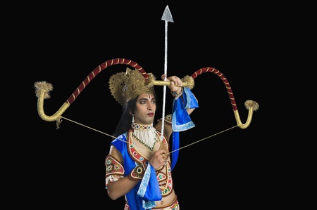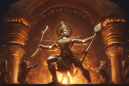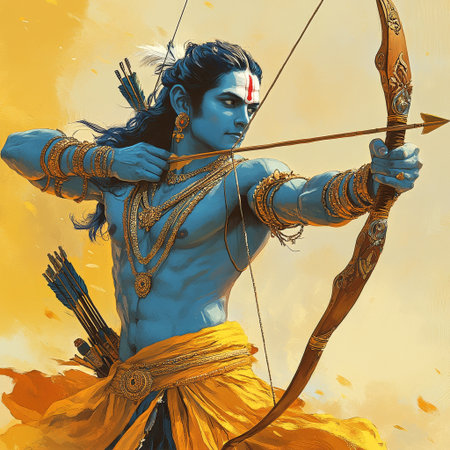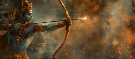 A powerful depiction of Lord Rama pulling back his bow, symbolizing the victory of good over evil, celebrated during the Dussehra festival.