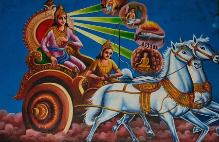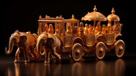 Golden statues depict a dynamic scene of deities riding a chariot pulled by four horses. The motion blur effect conveys speed and movement, creating a dramatic atmosphere