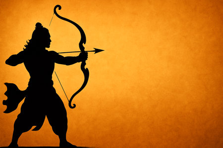 Lord Rama Silhouette with Bow and Arrow on Orange Background with Copy Space.