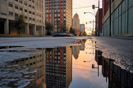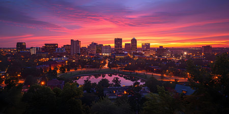 Romantic city skyline at twilight adorned with illuminated buildings and colorful skies. Concept Twilight Photography, City Skylines, Romantic Landscapes, Illuminated Buildings, Colorful Sunsets
