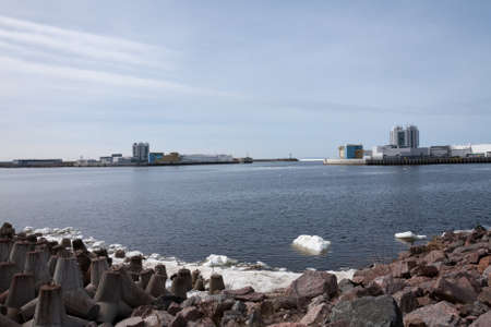 Mumansk, Russia - April 11, 2020: View of the typical northern russian town with soviet panel buildings in spring