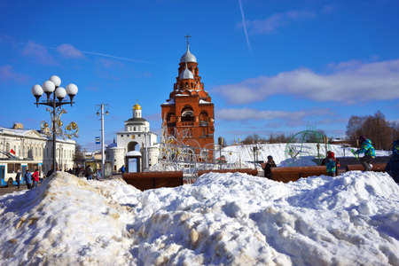 Vladimir, Russia - February 16.2019: Trinity Church and Golden Gate.