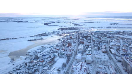Winter view from a drone.Clip. A view of the city from a height where all the houses are covered in snow, you can see roads with cars, a frozen river and a few trees and a bright sky without clouds.