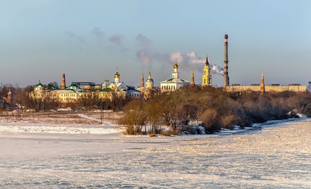 Winter landscape of the city of Kolomna, Moscow region in the winter cold snowy day. Panoramic view of the monastery.