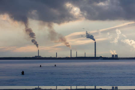Smoke from chimneys at a factory near a frozen lake in winter.
