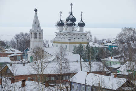 Panorama of a small city in the depths of Russia from a height. Orthodox churches and traditional old wooden houses, Totma and winter city view