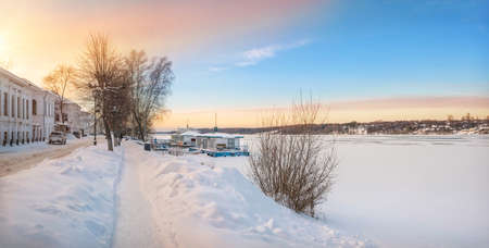The Volga River embankment in Plyos in the snow in the light of the setting winter sun