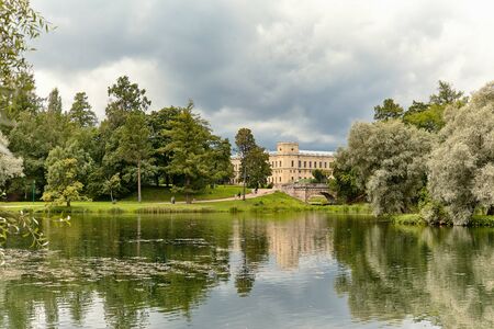 View of the Gatchina Palace from the side of the Palace Park, next to Karpin pond in autumn. St.Petersburg