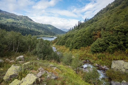 Russia, Caucasus. View of the valley of the Mzymta River and lake Kardyvach.
