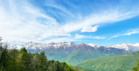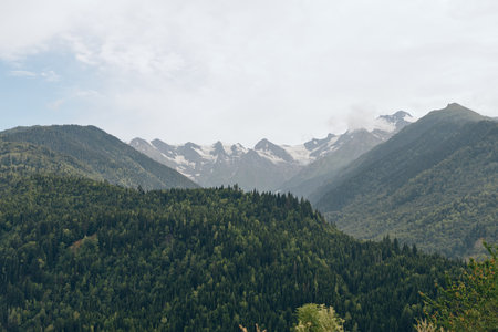 Mountain summer landscape with forest and high peaks. Caucasus. A view of the main Caucasian ridge. Biosphere Reserve resort Dombay. The concept of travel and tourism.