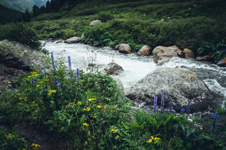 Vivid beautiful landscape with wild thickets above clear water of powerful mountain river. Colorful scenery of wild vegetations above transparent water of mountain creek. Wild flora of mountains.