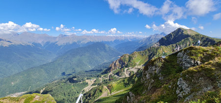 Panoramic summer view of the Aibga Ridge mountain range and hiking trails from Rosa Peak, Sochi, Russia.