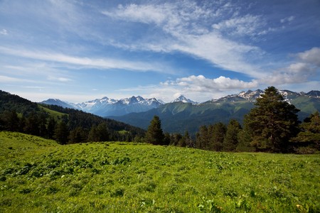 Snowy mountain peaks and green meadows and forests